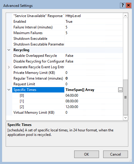 By default, an IIS application pool (or "AppPool") recycles on a regular time interval of 1740 minutes, or 29 hours. One reason for this time interval is that application pools don't recycle at the same moment every day (every day at 07.00 for example).