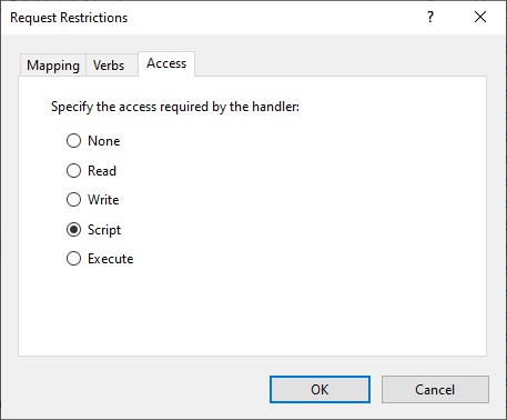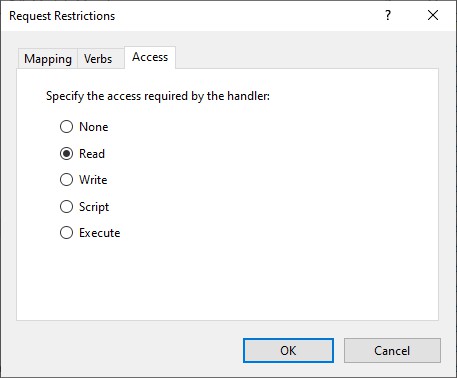 You can use the following PowerShell or appcmd.exe commands to configure an accessPolicy for handlers. Substitute example.com with your website name: