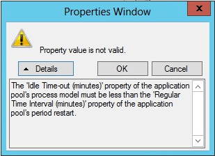 Setting the AppPool Idle Time-out property to zero (0) – because you want to set the Regular Time Interval to 0 – may result in unwanted AppPool and website behavior… This is a known bug in the IIS Manager GUI.
